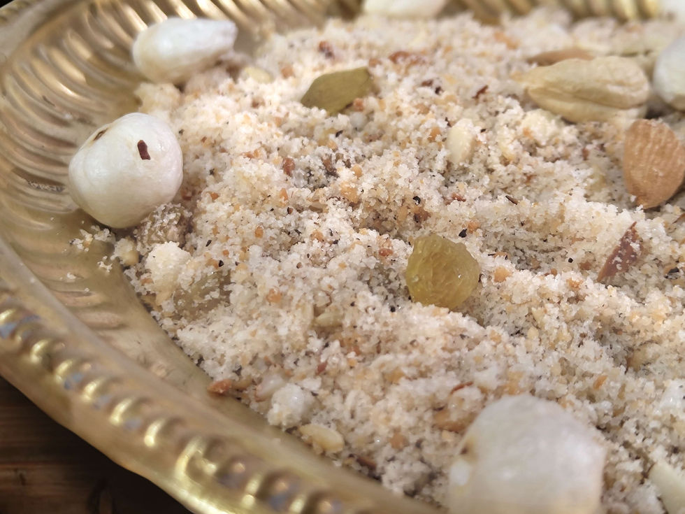 Coconut, Fox Nut, Gondh, Muskmelon seeds, Almonds, Cashews, Raisins, Khaand ki Boora, Desi Ghee